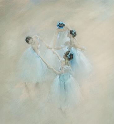 上掲のようなバレエダンサーの写真を元に独特の技法で絵画を描いています。